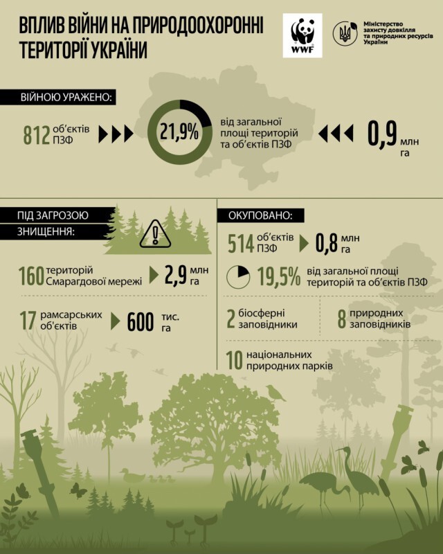Під окупацією зараз залишаються 10 заповідників і 7 національних природних парків. Серед них Чорноморський біосферний заповідник (на території та акваторії Херсонської та Миколаївської областей), біосферний заповідник «Асканія-Нова», національні природні парки Азово-Сиваський, «Олешківські Піски», Джарилгацький (Херсонська область), «Великий луг» та Приазовський (Запорізька область), «Білобережжя Святослава» (Миколаївська область), «Меотида» (Донецька область), «Кремінські ліси» (Луганська область) та «Чарівна Гавань» (АР Крим) та багато інших.