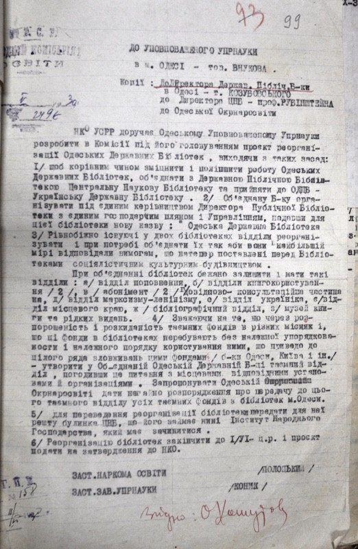 Постанова Раднаркому УСРР про створення Одеської державної наукової бібліотеки (1930 р.)