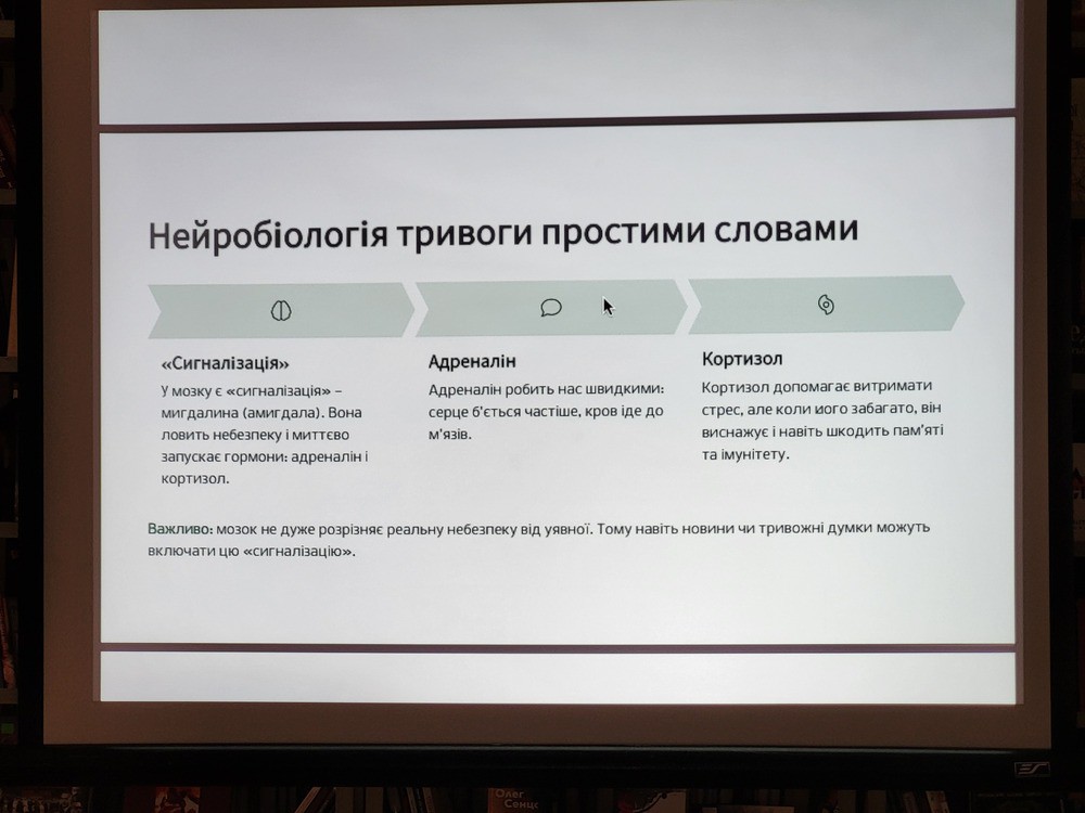Пані Катерина у доступній формі пояснила, як розпізнати тривожний стан і які перші сигнали свідчать про те, що організм перебуває у стресі. Вона розповіла про нейробіологію тривоги простими словами: що відбувається в мозку, чому активується «система тривоги» і як наш організм реагує на небезпеку.