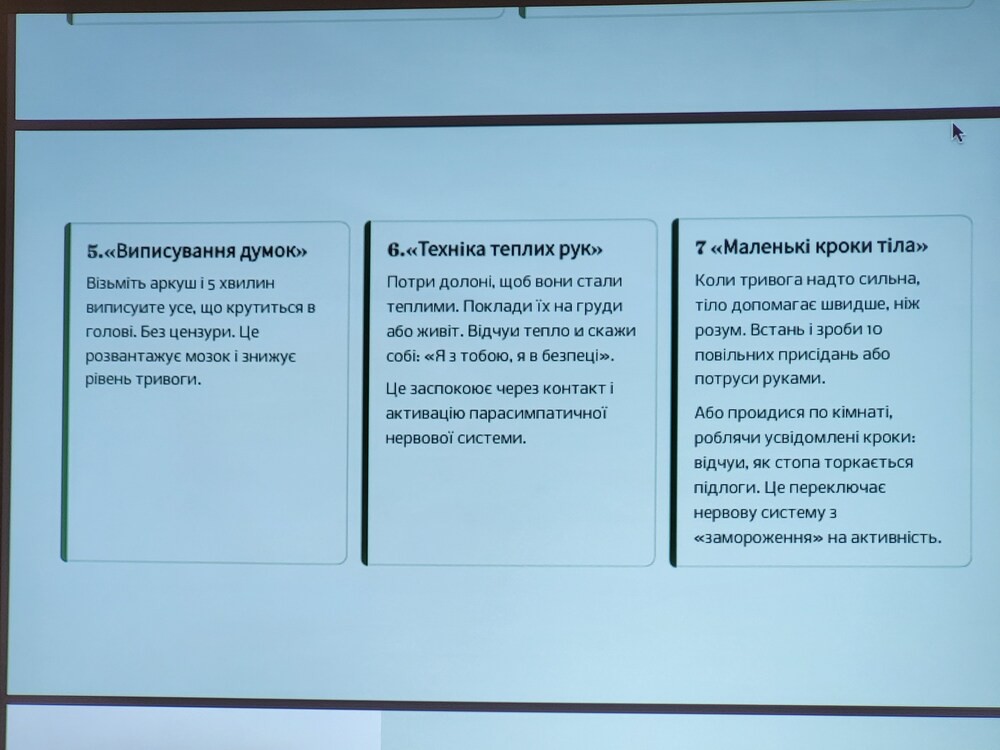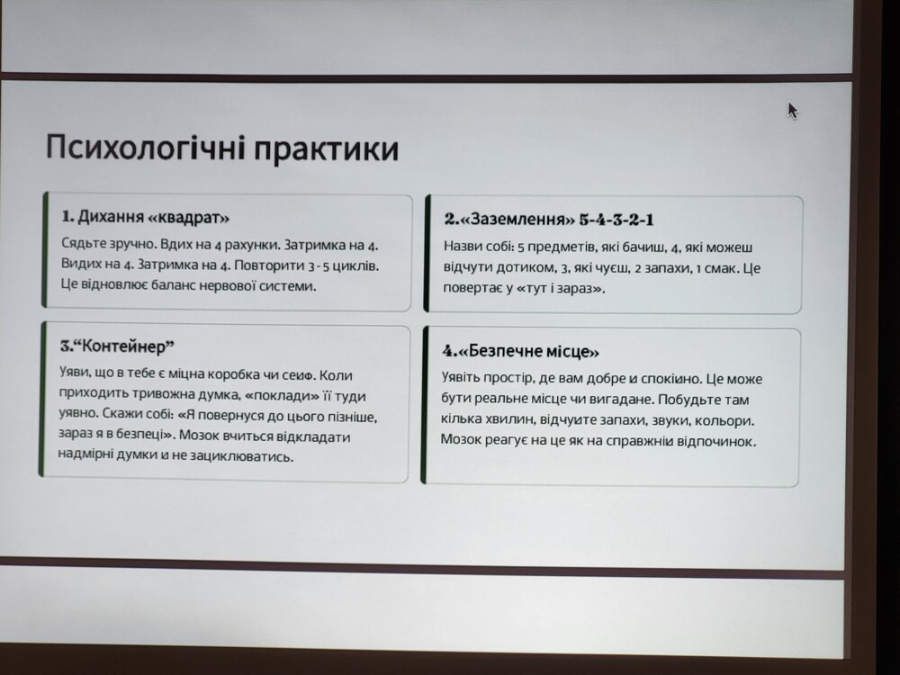 Окрема частина була присвячена практичним психологічним вправам. Учасники змогли спробувати дихальні техніки для зниження рівня напруги: «дихання по квадрату», коли вдих, затримка, видих і знову затримка тривають по чотири секунди; а також вправу на «повільний видих», що допомагає стабілізувати пульс і заспокоїти нервову систему. Такі прості практики, за словами психолога, можна застосовувати будь-де — вдома, на роботі чи навіть у транспорті.