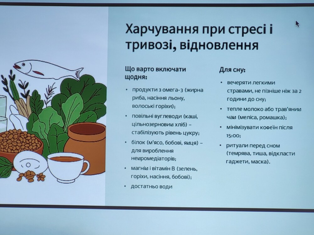 Не менш важливу увагу лекторка приділила харчуванню під час тривоги й стресу. Вона наголосила, що в стані емоційного напруження ми часто «заїдаємо» проблеми солодким або жирним. Однак таке харчування лише погіршує стан організму. Пані Катерина порадила віддавати перевагу продуктам, які допомагають нервовій системі відновлюватися: овочам, фруктам, продуктам із магнієм (горіхи, насіння), вітаміном B (цільнозернові, бобові), а також достатній кількості води. Вона підкреслила, що збалансоване харчування є важливим елементом у подоланні тривожності та підтриманні психоемоційної рівноваги.