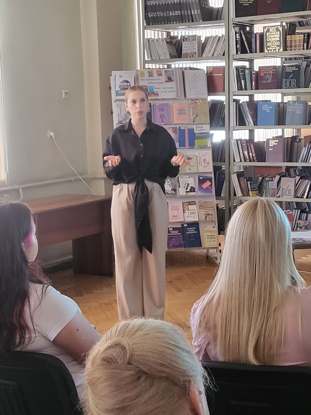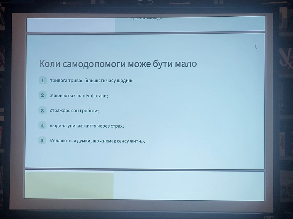 22 вересня 2025 року в читальному залі Одеської національної наукової бібліотеки (вул. Акад. Філатова, 1) відбулася лекція «Тривожний стан під час війни. Самодопомога» з психологом і нутриціологом Катериною Сергеєвою. Захід пройшов у межах Всеукраїнської програми ментального здоров’я «Ти як?», ініційованої першою леді України Оленою Зеленською. Мета цієї програми – формування культури піклування про себе, адже ментальне здоров’я є невід’ємною складовою сили та витривалості суспільства в умовах війни.