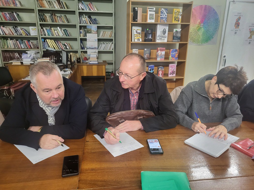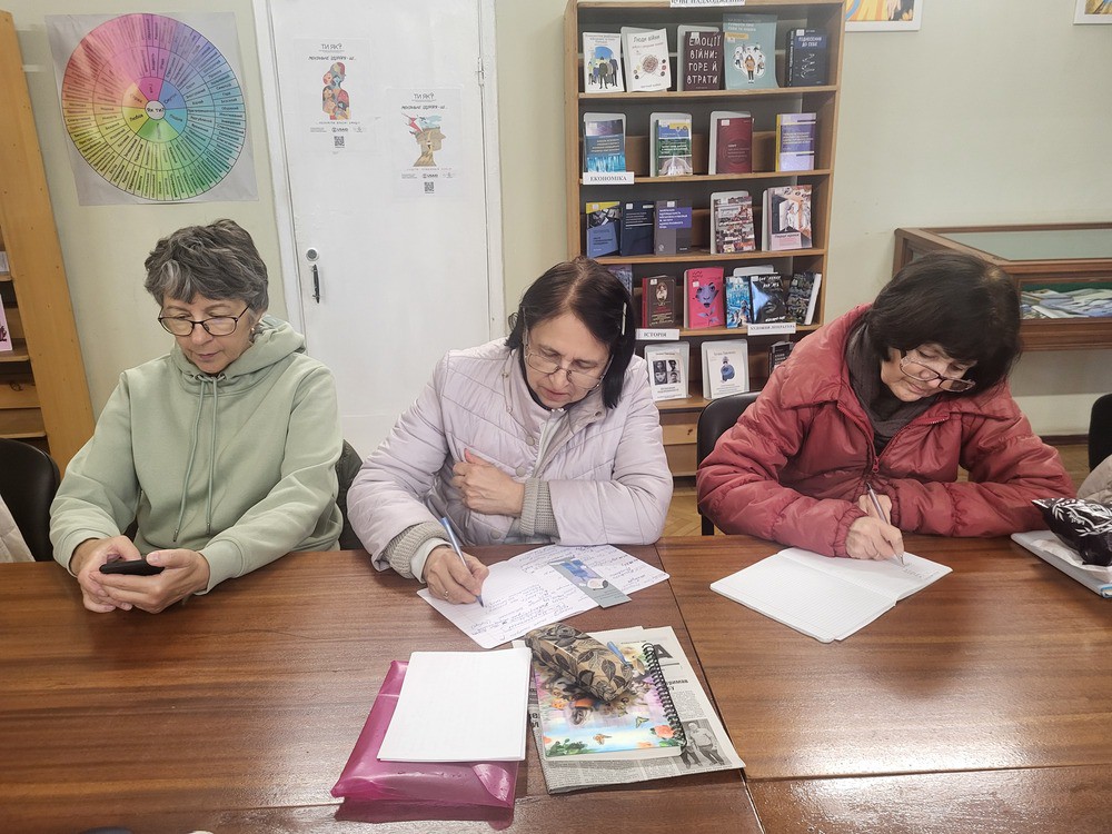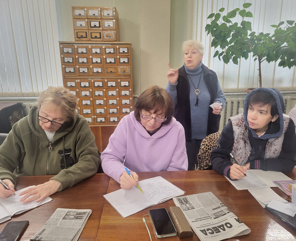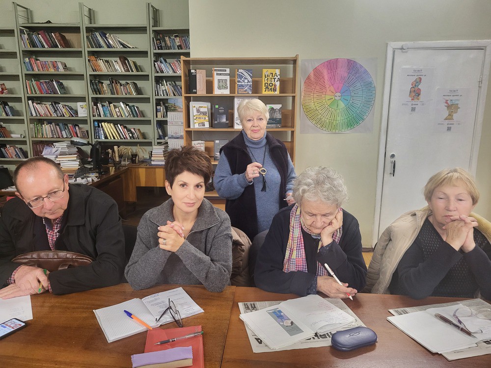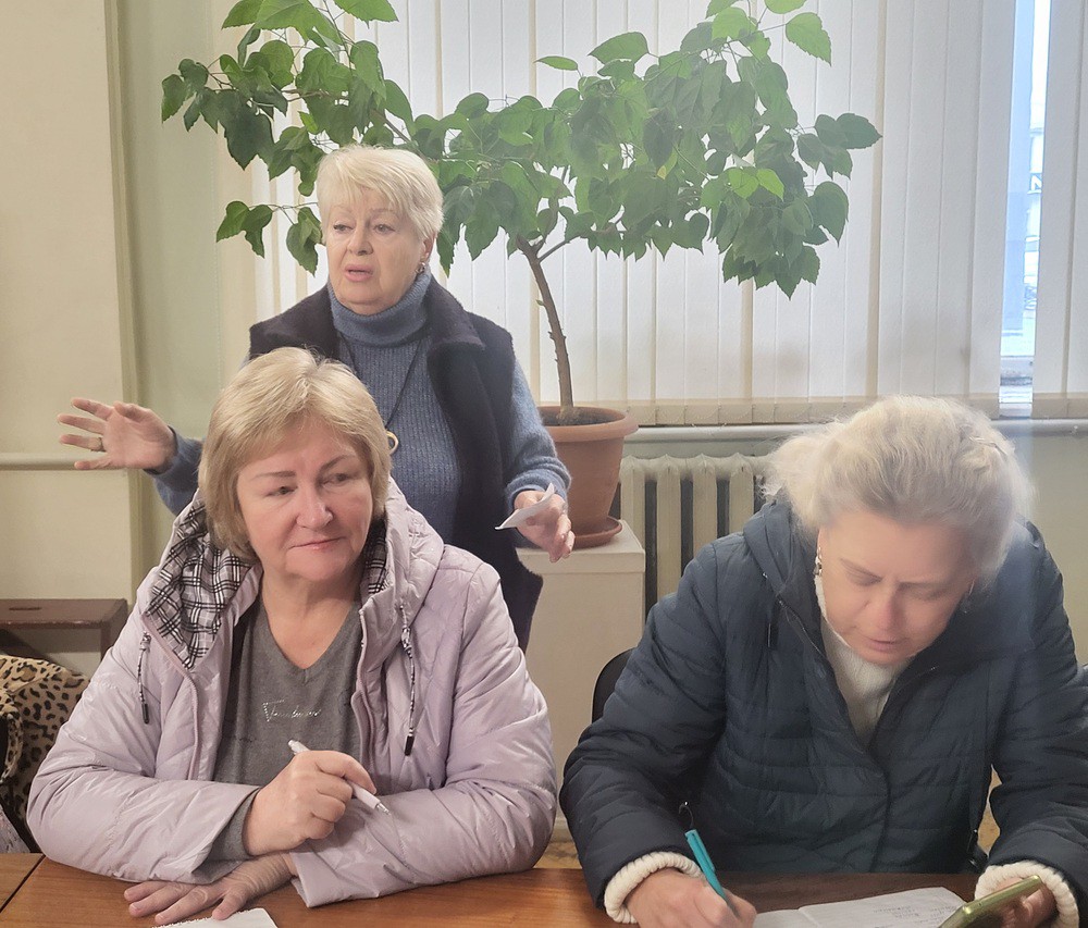 Традиційно засідання розпочалося з мовного блоку: Тетяна Петрівна звернула увагу на правильне вживання прислівників із дієсловами та прикметників з іменниками. Окремо було розглянуто поширену помилку –конструкцію «щире дякую». Учасники виконали вправи, що допомогли закріпити норми дієслівно-прислівникових словосполучень і зробили практичні висновки для мовлення.