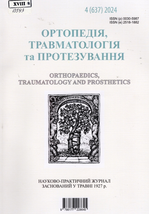 Ортопедія, травматологія та протезування = Orthopaedics, traumatology and prosthetics : щокварт. наук.-практ. журн. / Засновник ДУ "Ін-т патології хребта та суглобів ім. проф. М. І. Ситенка НАМН України", ВГО "Укр. асоц. ортопедів-травматологів" ; гол. ред. М. О. Корж. – Харків, 2024. – № 4 (637): жовт.-груд. – 117 с.