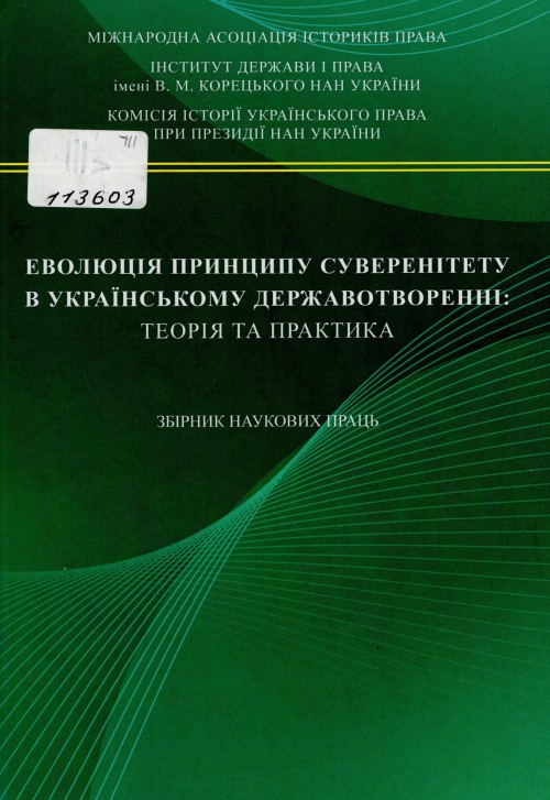 Еволюція принципу суверенітету в українському державотворенні: теорія та практика = Evolution of the principle of sovereignty in the Ukrainian state: theory and practice : зб. наук. праць / Міжнар. асоц. істориків права, НАН України, Ін-т держави і права ім. В. М. Корецького, Комісія історії укр. права при Президії НАН України ; співголова Олександр Васильович Скрипнюк, Ігор Борисович Усенко ; редкол. Анастасія Юріївна Іванова, Тетяна Іванівна Бондарук, Анжеліка Романівна Крусян ; передм. Олександр Васильович Скрипнюк. – Київ : Талком, 2024. – 207 с.