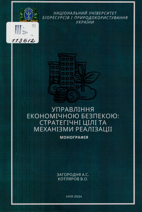 Загородня А. С. Управління економічною безпекою: стратегічні цілі та механізми реалізації : монографія / Альона Сергіївна Загородня, Валерій Олександрович Котляров ; Нац. ун-т біоресурсів і природокористування України. – Київ : Нац. ун-т біоресурсів і природокористув. України, 2024. – 197 с. : іл., табл.