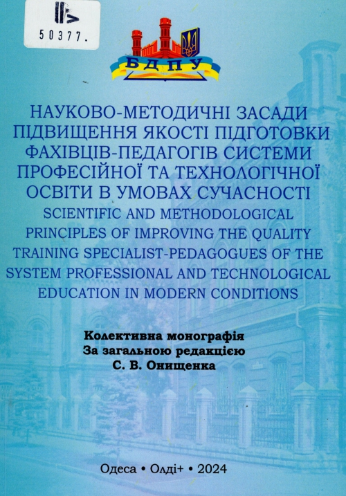 Науково-методичні засади підвищення якості підготовки фахівців-педагогів системи професійної та технологічної освіти в умовах сучасності = Scientific and methodological principles of improving the quality training specialists-pedagogues of the system professional and technological education in modern conditions : кол. монографія / Юлія Юріївна Бєлова-Олейник, Павло Георгійович Буянов, Лариса Василівна Горбатюк, Людмила Анатоліївна Даннік, Вікторія Іванівна Жигірь ; Бердян. держ. пед. ун-т ; за заг. ред. Сергій Вікторович Онищенко. – Одеса : Олді+, 2024. – 221 с.