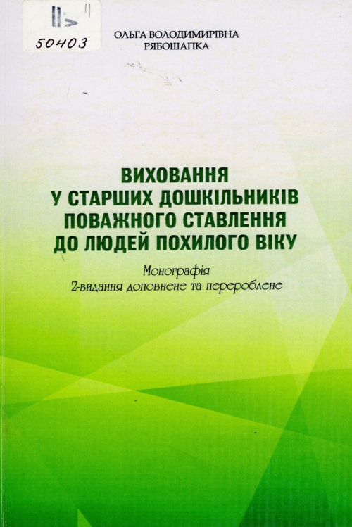 Рябошапка О. В.Виховання у старших дошкільників поважного ставлення до людей похилого віку : монографія / Ольга Володимирівна Рябошапка ; Уман. держ. пед. ун-т ім. П. Тичини. – 2-ге вид, допов. та перероб. – Умань : Сочінський М. М., 2024. – 305 с. : іл., табл.