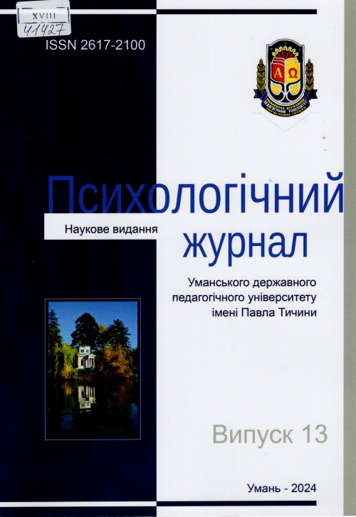 Психологічний журнал = Psychologicaljournal : щоріч. наук. журн. / Засновник Уман. держ. пед. ун-т ім. П. Тичини ; гол. ред. Олександр ДжамільовичСафін. – Умань : Візаві, 2024. – Вип. 13. – 147 с.