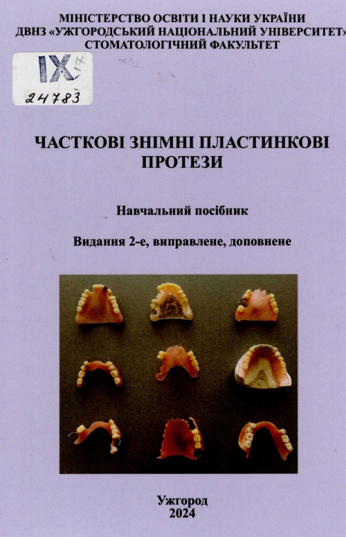 Часткові знімні пластинкові протези : навч. посіб. / Є. Ю. Локота, С. Б. Костенко, М. О. Стецик, Ю. Є. Локота, А. В. Криванич ; ДВНЗ "Ужгород. нац. ун-т". – Вид. 2-ге, випр., допов. – Ужгород : УжНУ "Говерла", 2024. – 170 с. : іл., табл.