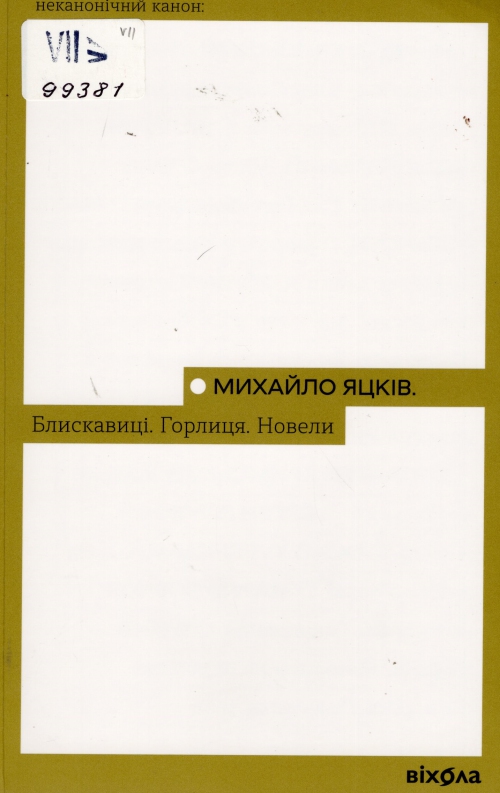 Яцків М. Ю. Блискавиці : повість; Горлиця : повість; Новели / Михайло Юрійович Яцків ; передм. Ірина Борисюк ; післям. Микола Ільницький. – Київ : Віхола, 2024. – 297, [1] с. – (Неканонічний канон).