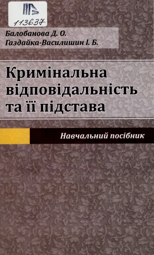 Балобанова Д. О.Кримінальна відповідальність та її підстава : навч. посіб. / Д. О. Балобанова, І. Б. Газдайка-Василишин ; Львів. держ. ун-т внутрішніх справ.– Львів : Львів. держ. ун-т внутр. справ, 2024.– 51 с. : табл.