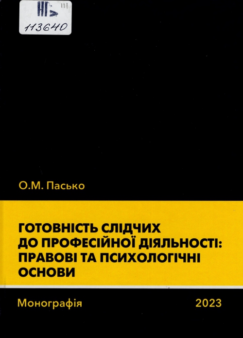 Пасько О. М.Готовність слідчих до професійної діяльності: правові та психологічні основи : монографія / Оксана Миколаївна Пасько ;Одес. держ. ун-т внутрішніх справ.– Одеса : Юридика, 2023.– 475 с. : іл., табл., схеми.