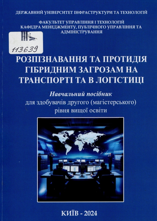 Розпізнавання та протидія гібридним загрозам на транспорті та в логістиці : навч. посіб. : для здобувачів другого (магістер.) рівня вищ. освіти / Держ. ун-т інфраструктури та технологій, Ф-т упр. і технологій; уклад. О. О. Карпенко, Є. Л. Осипова.– Київ : ТРОПЕА, 2024.– 66 с. : рис., табл.