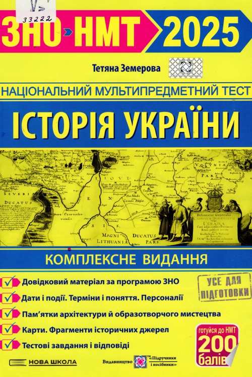 Земерова Т. Ю. Історія України. Комплексна підготовка до ЗНО/НМТ : за чинною програмою ЗНО / Тетяна Юріївна Земерова.– Тернопіль : Підручники і посібники, 2024.– 638 с. : іл., портр., карти.– (Національний мультипредметний тест. 2025) (Готуйся до НМТ 200 балів) (Нова школа).