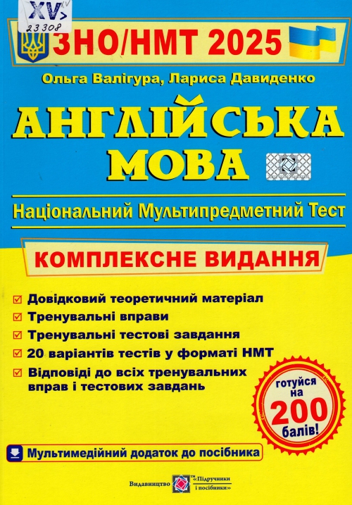 Валігура О. Р . Англійська мова. Комплексна підготовка до зовнішнього незалежного оцінювання : за чинною програмою ЗНО / Ольга Романівна Валігура, Лариса Михайлівна Давиденко. – Вид. 6-те, випр. – Тернопіль : Підручники і посібники, 2024. – 591 с. : іл., табл. – (ЗНО/НМТ. 2025) (Готуйся на 200 балів!) (Національний мультипредметний тест. 2025).