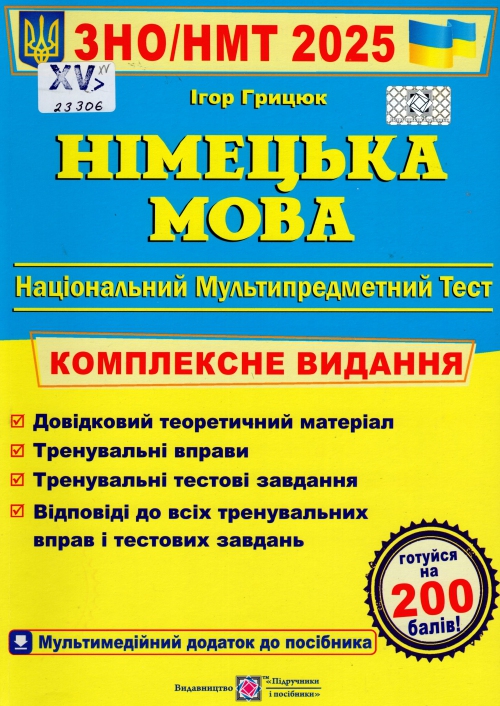 Німецька мова : комплексна підготовка до зовнішнього незалежного оцінювання : за чинною програмою ЗНО / Уклад. Ігор Васильович Грицюк. – Тернопіль : Підручники і посібники, 2024. – 288 с. : табл., QR-коди.– (ЗНО/НМТ. 2025) (Готуйся на 200 балів!) (Національний мультипредметний тест. 2025).
