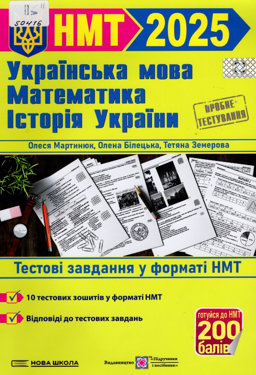 Тренажер для підготовки до національного мультипредметного тесту. Математика. Українська мова. Історія України : тестові завдання у форматі НМТ : 10 тест. зошитів у форматі НМТ, відповіді до тест. завдань / Олеся Миронівна Мартинюк, Олена Іванівна Білецька, Михайлина Леонівна Шумка, Тетяна Юріївна Земерова. – Тернопіль : Підручники і посібники, 2024. – 174, [1] с. : іл., портр., табл., карти. – (Національний мультипредметний тест. 2025) (Готуйся до НМТ 200 балів). – Українська мова. Математика. Історія України. Тестові завдання у форматі НМТ.