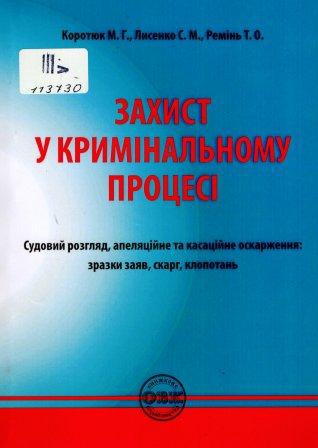 Коротюк М. Г. Захист у кримінальному процесі. Судовий розгляд, апеляційне та касаційне оскарження: зразки заяв, скарг, клопотань / Михайло Геннадійович Коротюк, Сергій Миколайович Лисенко, Тетяна Олександрівна Ремінь ; під заг. ред. Михайло Геннадійович Коротюк. – Київ : ОВК, 2024. – 455 с.