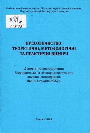 Пресознавство: теоретичні, методологічні та практичні виміри : доп. та повідомл. Всеукр. з міжнар. участю наук. конф., Львів, 1 груд. 2023 р. / Львів. нац. наук. б-ка України ім. В. Стефаника, НДІ пресознавства ; відп. ред. Надія Кулеша. – Львів : Галицька видавнича спілка, 2024. – 194 с.
