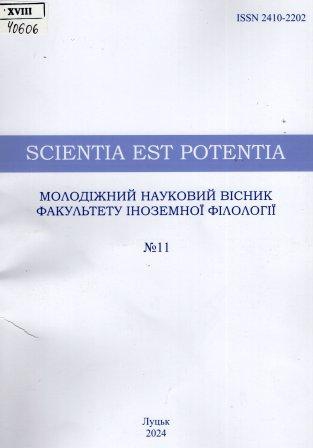 Scientia est potentia: молодіжний науковий вісник інституту іноземної філології : наук. журн. / Засновник Східноєвроп. нац. ун-т ім. Л. Українки, Наук. тов-во аспірантів і студентів ін-ту інозем. філології ; редкол. Ірина Павлівна Біскуб. – Луцьк : Східноєвроп. нац. ун-т ім. Лесі Українки, 2024. – № 11. – 100 с.
