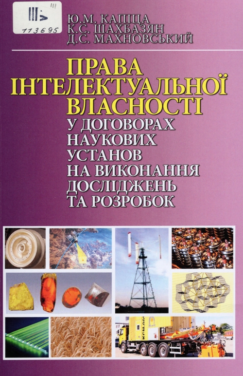 Капіца Ю. М. Права інтелектуальної власності у договорах наукових установ на виконання досліджень та розробок / Юрій Михайлович Капіца, Карина Суренівна Шахбазян, Дмитро Станіславович Махновський ; Нац. акад. наук України, Центр досліджень інтелектуальної власності та трансферу технологій НАН України (Київ) ; за ред. Юрій Михайлович Капіца. – Київ : Академперіодика, 2024. – 458, [1] с. : табл.
