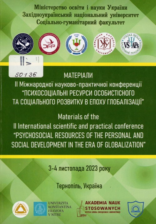 Психосоціальні ресурси особистісного та соціального розвитку в епоху глобалізації : матеріали II Міжнар. наук.-практ. конф., м. Тернопіль, 3-4 листопада 2023 року / Західноукр. нац. ун-т (м. Тернопіль), Католиц. ун-т у Ружомберку (Словаччина), Коледж прикладної психології в м. Терезін (Чеська Республіка) ; оргком. Ян ван Звітен, Патрік Матурканіч, Мартін Тарай. – Тернопіль : ЗУНУ, 2023. – 412 с. : іл., схеми.