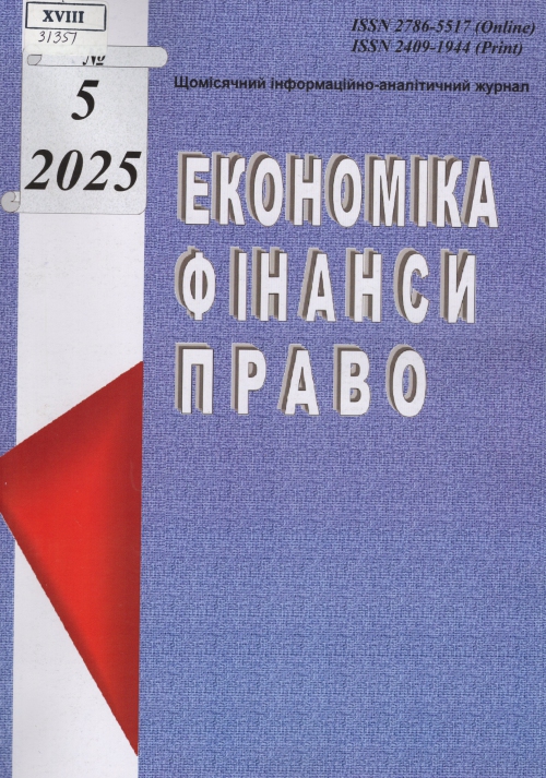 Економіка. Фінанси. Право = Economics. Finances. Law : щоміс. інформ.-аналіт. журн. / Засновник Аудит. фірма "Аналітик" ; гол. ред. Валентина Петрівна Левченко. – Київ : [б.в.], 2025. – № 5. – 139 с.