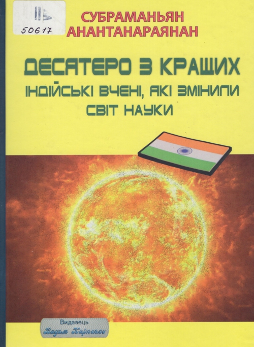 Анантанараянан С. Десятеро з кращих. Індійські вчені, які змінили світ науки : пер. с англ. / Субраманьян Анантанараянан ; Культ.-освіт. центр неформальної освіти Центр. будинку офіцерів Збройних Сил України ; упоряд. і перекл. Вадим Миколайович Карпенко ; вступ. сл. Сергій Корня ; передм. Василь Тимків. – Київ : Вадим Карпенко, 2025. – 103, [1] с. : іл., портр.