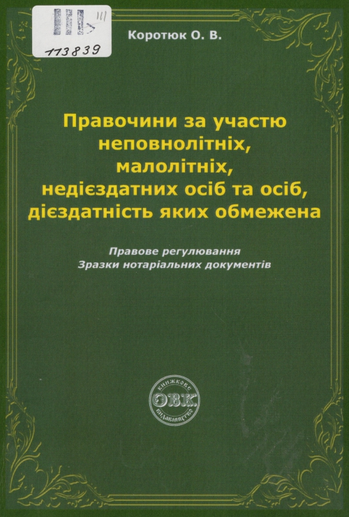 Коротюк О. В. Правочини за участю неповнолітніх, малолітніх, недієздатних осіб та осіб, дієздатність яких обмежена : правове регулювання : зразки нотаріальних документів : практичний посібник / Оксана Вікторівна Коротюк. – Київ : ОВК, 2025. – 303 с. : табл.