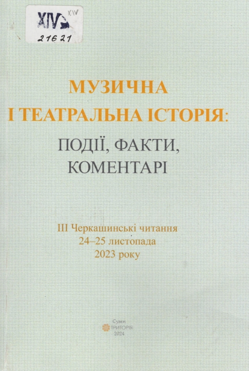 Музична і театральна історія: події, факти, коментарі = Music and theater history : events, facts, comments : ІII Черкашинські читання, 24-25 листопада 2023 року / Благодійний фонд "Мистецький альянс", ГО "Музикознавці України у світовій культурі" (МУУСК) ; упоряд. Ірина Степанівна Драч ; редкол. Марина Романівна Черкашина-Губаренко, Ірина Степанівна Драч, Яна Вікторівна Партола ; передм. Наталія Олегівна Говорухіна. – Суми : Триторія, 2024. – 311 с. : портр.
