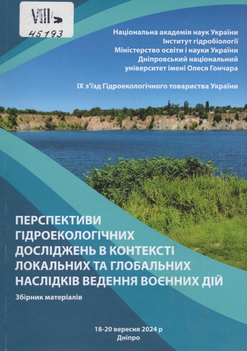 Перспективи гідроекологічних досліджень в контексті локальних та глобальних наслідків ведення воєнних дій : зб. матеріалів IX з'їзду Гідроеколог. т-ва України, 18-20 верес. 2024 р. / Гідроеколог. тов-во України, НАН України. Ін-т гідробіології, Дніпров. нац. ун-т ім. Олеся Гончара ; гол. оргком. Сергій Олександрович Афанасьєв. – Дніпро : Ліра, 2024. – 287 с. : рис., табл.