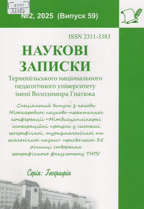 Наукові записки Тернопільського національного педагогічного університету імені Володимира Гнатюка. Серія: Географія : зб. / Засновник Терноп. нац. пед. ун-т ім. В. Гнатюка ; редкол. В'ячеслав Андрейчук. – Тернопіль : ТНПУ ім. В. Гнатюка, 2025. – № 2 (Вип. 59). – 162 с.