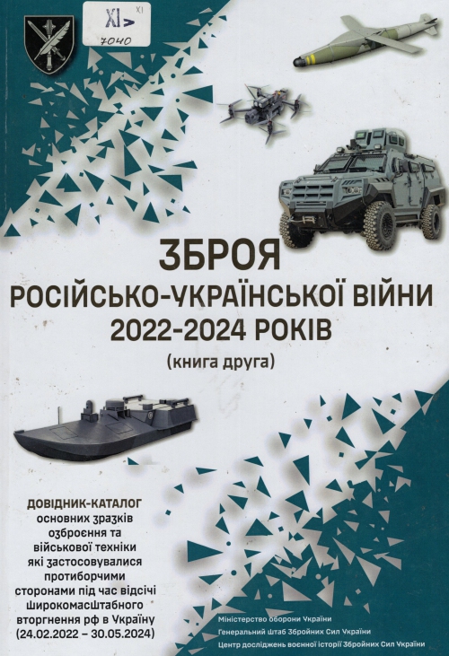Кн. 2 : 2022-2024 років : довід.-кат. основ. зразків озброєння та військ. техніки які застосовувалися протиборчими сторонами під час відсічі широкомасштабного вторгнення рф в Україну (01.06.2022–30.05.2024) / Сергій Таранець, Сергій Ушаков, Микола Голка, Павло Павлов, Олег Брюшковський ; робоча група Олександр Станіславович Сирський, Вадим Сухаревський, Андрій Лебеденко. – 2024. – 309 с. : кольор. іл., табл.