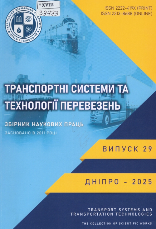 Транспортні системи та технології перевезень : зб. наук. пр. Дніпропетровського національного ун-ту залізничного транспорту ім. В. Лазаряна / Засновник Дніпропетр. нац. ун-т залізн. трансп. ім. акад. В. Лазаряна ; гол. ред. В. І. Бобровський. – Дніпропетровськ : [б.в.],2025. – Вип. 29. – 129 с.