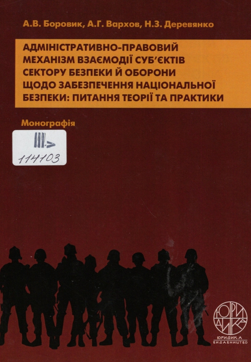 Боровик А В. Адміністративно-правовий механізм взаємодії суб'єктів сектору безпеки й оборони щодо забезпечення національної безпеки: питання теорії та практики : монографія / Андрій Володимирович Боровик, Андрій Григорович Вархов, Наталія Зеновіївна Деревянко ; Науково-дослідний ін-т публічного права. – Одеса : Юридика, 2024. – 184 с.