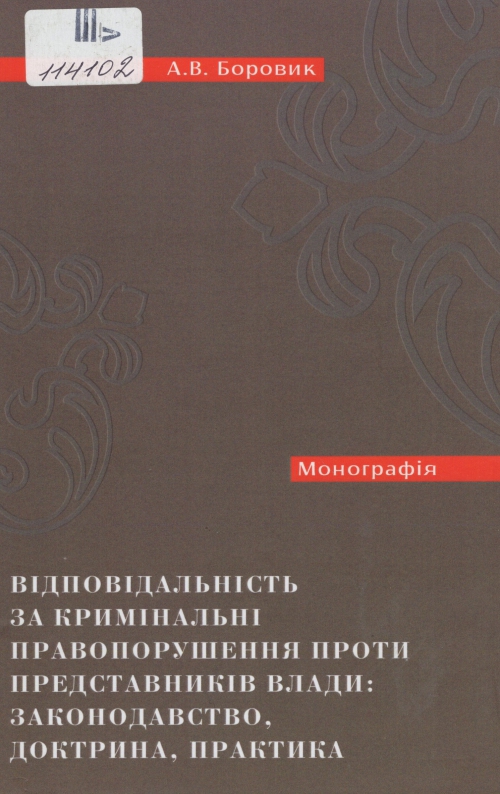 Боровик А. В. Відповідальність за кримінальні правопорушення проти представників влади: законодавство, доктрина, практика : монографія / Андрій Володимирович Боровик ; Науково-дослідний ін-т публічного права. – Одеса : Юридика, 2024. – 522 с. : табл.