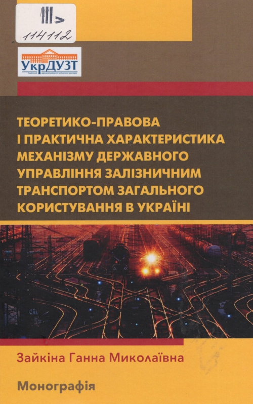 Зайкіна Г. М. Теоретико-правова і практична характеристика механізму державного управління залізничним транспортом загального користування в Україні : монографія / Ганна Миколаївна Зайкіна ; Укр. держ. ун-т залізничного транспорту. – Одеса : Юридика, 2024. – 271 с.