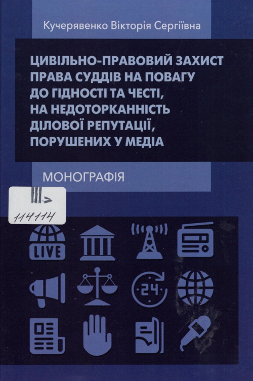 Кучерявенко В. С. Цивільно-правовий захист права суддів на повагу до гідності та честі, на недоторканність ділової репутації, порушених у медіа : монографія / Вікторія Сергіївна Кучерявенко. – Одеса : Юридика, 2023. – 233 с.