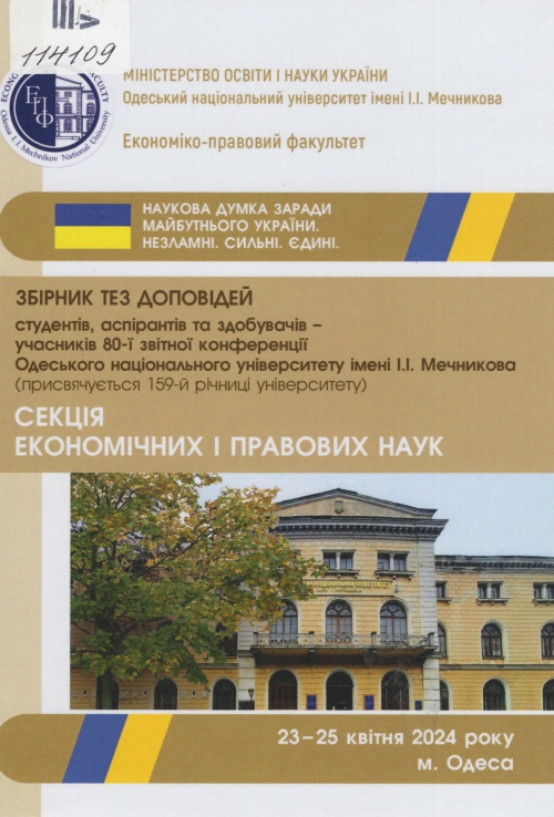 Збірник тез доповідей студентів, аспірантів та здобувачів - учасників 80-ї звітної конференції Одеського національного університету імені І. І. Мечникова (присвячується 159-річниці університету). Секція економічних і правових наук, 23-25 квітня 2024 року, м. Одеса / Одес. нац. ун-т ім. І. І. Мечникова, Економіко-правовий ф-т ; відп. ред. О. В. Побережець ; редкол. Л. Є. Борисова, Н. В. Добровольська, О. І. Донченко. – Одеса : Олді+, 2024. – 473 с. : рис., табл.