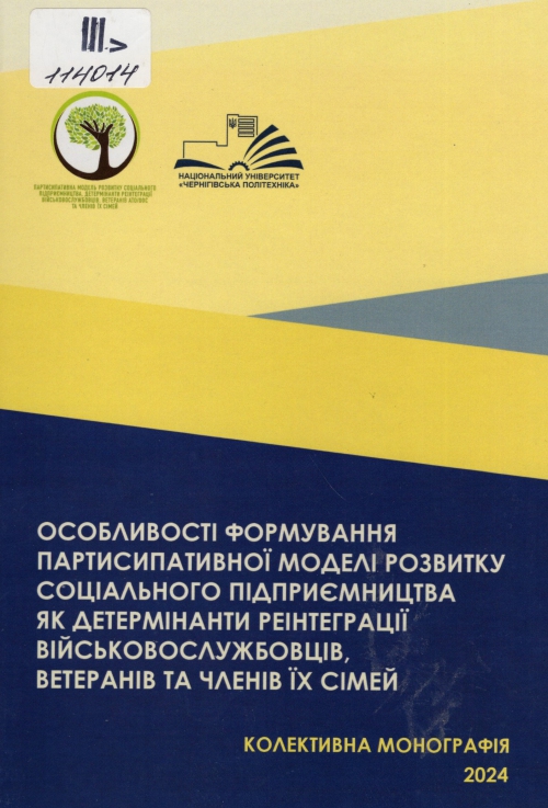 Особливості формування партисипативної моделі розвитку соціального підприємництва як детермінанти реінтеграції військовослужбовців, ветеранів та членів їх сімей : кол. монографія / Альона Миколаївна Ревко, Анна Вікторівна Вербицька, Надія Сергіївна Нагорна, Ганна Андріївна Дивнич, Олена Леонідівна Петрик ; Нац. ун-т "Чернігівська політехніка" ; за заг. ред. Альона Миколаївна Ревко. – Одеса : Гельветика, 2024. – 117 с. : рис., табл.