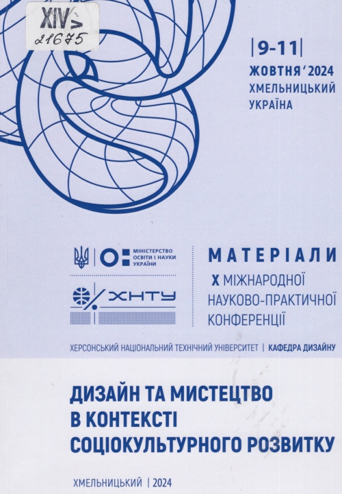Дизайн та мистецтво в контексті соціокультурного розвитку = Socio-cultural trends in the development of modern design and art : матеріали X Міжнар. наук.-практ. конф., 09-11 жовтня 2024 р., м. Хмельницький, Україна / ДНУ "Ін-т модернізації змісту освіти", Херсон. нац. техн. ун-т. Кафедра дизайну ; гол. редкол. Олена Валеріївна Чепелюк ; редкол. Анна Анатоліївна Білик, Олена Володимирівна Колосніченко, Тетяна Федорівна Кротова ; за ред. Анна Анатоліївна Білик. – Одеса : Олді+, 2024. – 259. : іл., фот., табл.