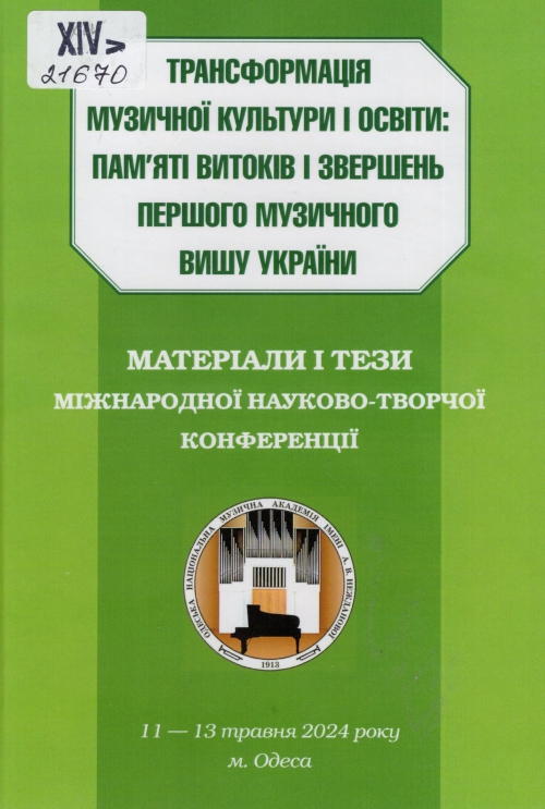 Трансформація музичної культури і освіти: пам'яті витоків і звершень першого музичного вишу України : матеріали і тези Міжнар. наук.-творч. конф., 11-13 трав. 2024 р., м. Одеса / Одес. нац. муз. акад. ім. А. В. Нежданової, Одес. орг. Нац. спілки композиторів України ; оргком. Олександр Леонідович Олійник, Ольга Вадимівна Оганезова, Олена Михайлівна Хіль. – Одеса : Астропринт, 2024. – 238 с.