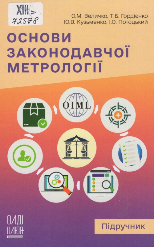 Основи законодавчої метрології : підручник / Олег Миколайович Величко, Тетяна Богданівна Гордієнко, Юрій Володимирович Кузьменко, Ігор Олексійович Потоцький ; ДП "Всеукр. держ. наук.-вироб. центр стандартизації, метрології, сертифікації та захисту прав споживачів (ДП "УКРМЕТРТЕСТСТАНДАРТ") ; за заг. ред. Олег Миколайович Величко. – Одеса : Олді+, 2024. – 432 с. : іл., табл.