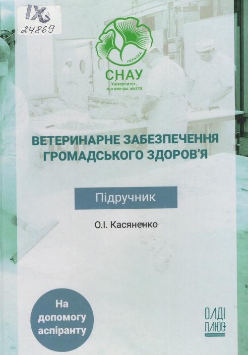 Касяненко О. І. Ветеринарне забезпечення громадського здоров'я : підручник / Оксана Іванівна Касяненко ; Сум. нац. аграр. ун-т. – Одеса : Олді+, 2024. – 143 с. : рис., табл. – (На допомогу аспіранту).