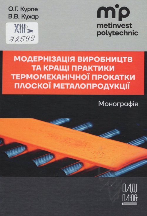 Курпе О. Г. Модернізація виробництв та кращі практики термомеханічної прокатки плоскої металопродукції : монографія / Олександр Геннадійович Курпе, Володимир Валентинович Кухар ; ТОВ "Техн. ун-т "Метінвест політехніка". – Одеса : Олді+, 2025. – 356 с. : рис., табл.