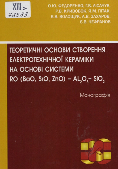 Теоретичні основи створення електротехнічної кераміки на основі системи RO (BaO, SrO, ZnO) – Al2O3 – SiO2 : монографія / О. Ю. Федоренко, Г. В. Лісачук, Р. В. Кривобок, Я. М. Пітак, В. В. Волощук ; Нац. техн. ун-т "Харків. політехн. ін-т". – Одеса : Олді+, 2024. – 102 с. : рис., табл.