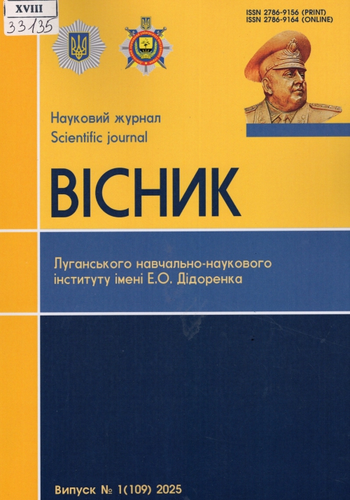 Вісник Луганського навчально-наукового інституту імені Е. О. Дідоренка = BulletinofLuhanskEducational-ScientificInstitutenamedafter E. Didorenko : наук. журн. / Засновник Луган. навч.-наук. ін-т ім. Е. О. Дідоренка, Донец. держ. ун-т внутрішніх справ ; гол. ред. Є. О. Письменський. – Кропивницький : ДонДУВС, Одеса : Гельветика, 2025. – Вип. 1 (109). – 215 с.