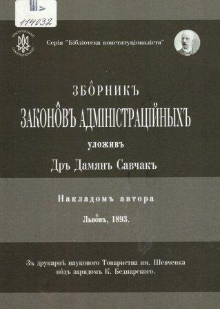 Збірник законів адміністраційних / Уклад. Дам'ян Антонович Савчак ; вступ Альберт Єзеров. – Репр. вид., 1893 р. – Одеса : Юридика, 2024. – 543 с. : портр., табл. – (Бібліотека конституціоналіста).