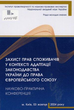 Захист прав споживачів у контексті адаптації законодавства України до права Європейського Союзу : наук.-практ. конф., м. Київ, 03 жовтня 2024 р. : зб. матеріалів / Ін-т правотворчості та наук.-прав. експертиз НАН України, Рада молодих вчених ; редкол. А. Б. Гриняк, Н. В. Міловська, М. М. Великанова. – Одеса : Юридика, 2024. – 157 с.